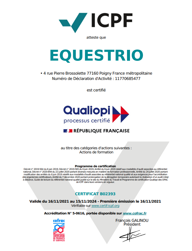 Equestrio est certifié Qualiopi au titre de la catégorie d’action : Action de formation